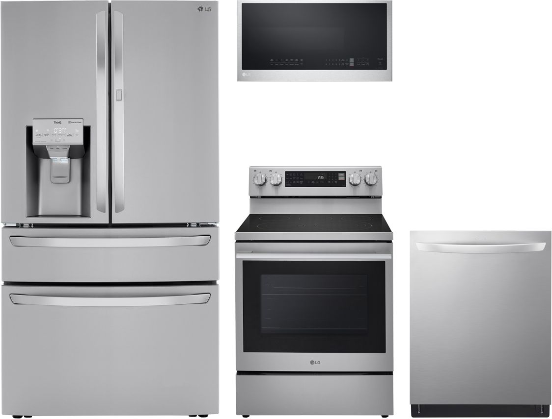 LG 4 Piece PrintProof™ Stainless Steel Kitchen Package with French door refrigerator, built in dishwasher, freestanding electric range and over the range microwave.Read More